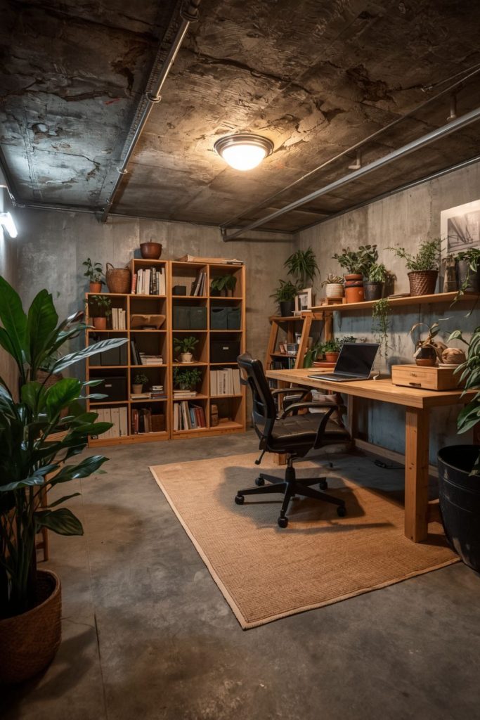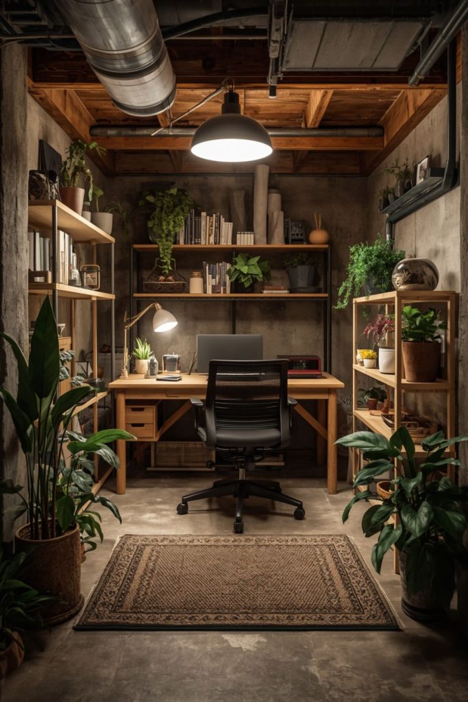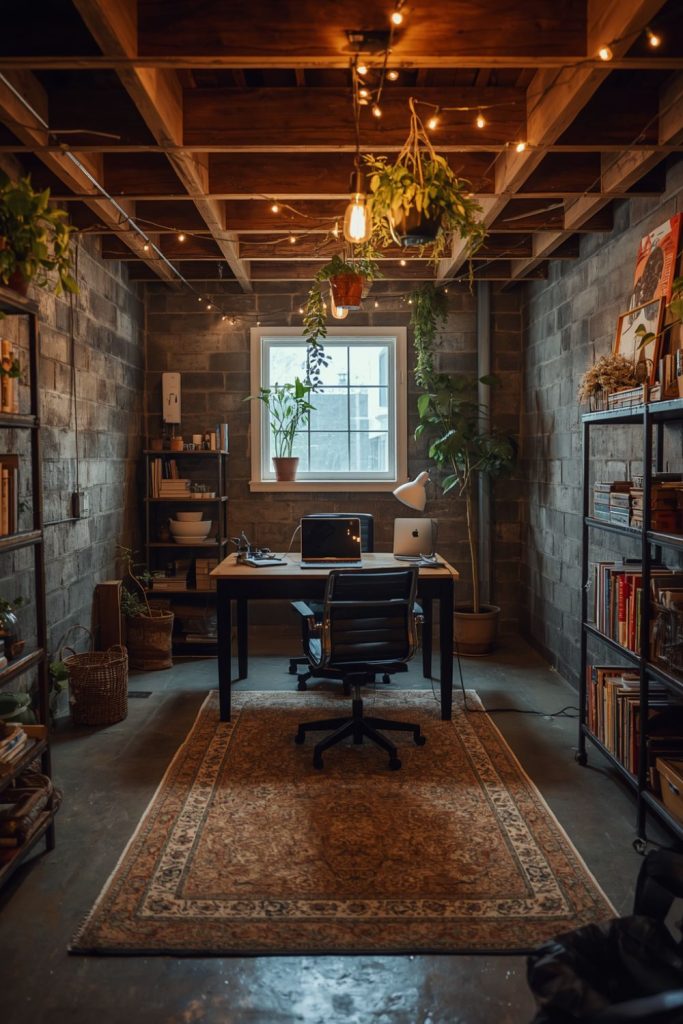 Hanging plants or lights from exposed beams transforms ceilings from an afterthought into a feature. It adds warmth, texture, and subtle decoration while complementing the unfinished basement office’s raw character.