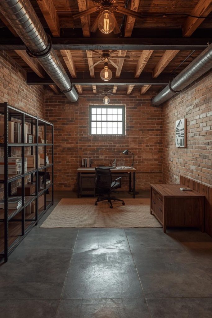 Industrial design works perfectly in an unfinished basement office because it complements the raw, unfinished vibe of the space. Exposed brick walls add texture and warmth without covering up structural elements, while steel shelving offers heavy-duty storage for books, office supplies, or equipment. Edison bulbs hanging from the ceiling provide soft, warm light that’s easy on the eyes and adds character. Combine a metal-framed desk with reclaimed wood surfaces to enhance the industrial look. Concrete floors can be softened with a neutral rug, and functional items like filing cabinets or rolling carts don’t detract from the style. The industrial theme also allows you to mix and match pieces over time without needing full renovations, making it an ideal choice for a cost-conscious unfinished basement office. The overall feel is professional but edgy, giving the impression of a space that is both modern and serious about productivity.