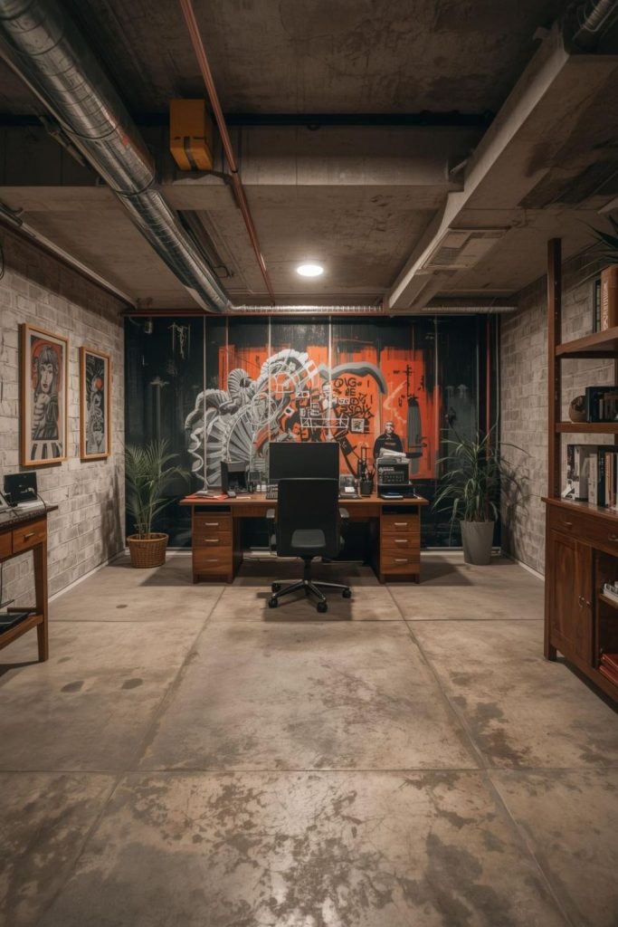 A mural or statement wallpaper instantly draws attention and defines the space. You can choose abstract designs, geometric patterns, or motivational imagery to personalize the unfinished basement office. Even one wall with a striking pattern makes the room feel intentional, creative, and finished without a full remodel.