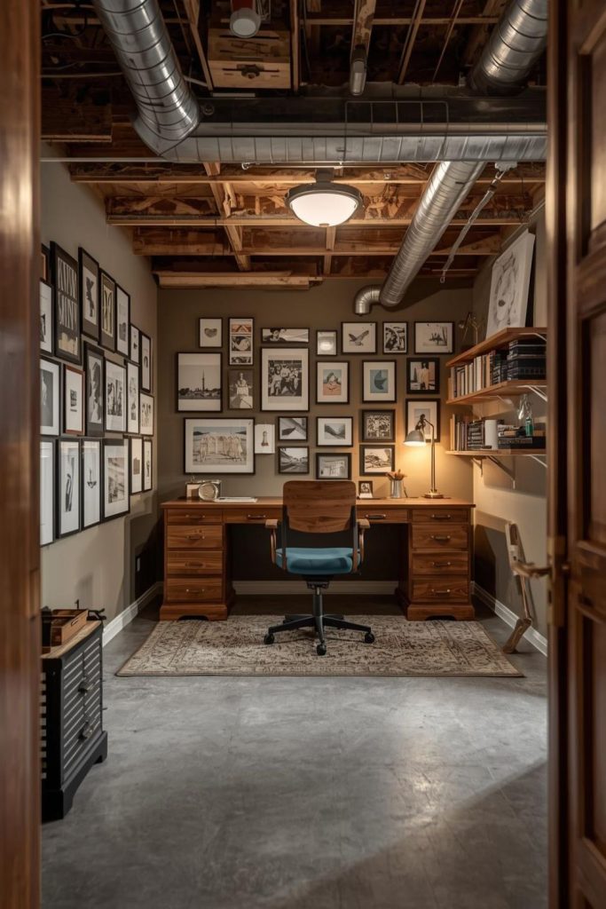 Adding a gallery wall helps bring personality into the unfinished basement office. Combine framed quotes, personal artwork, or photos for inspiration. It makes the space feel welcoming and curated while subtly reinforcing focus and motivation. This approach is low-cost, visually appealing, and easy to update as your style or projects change.