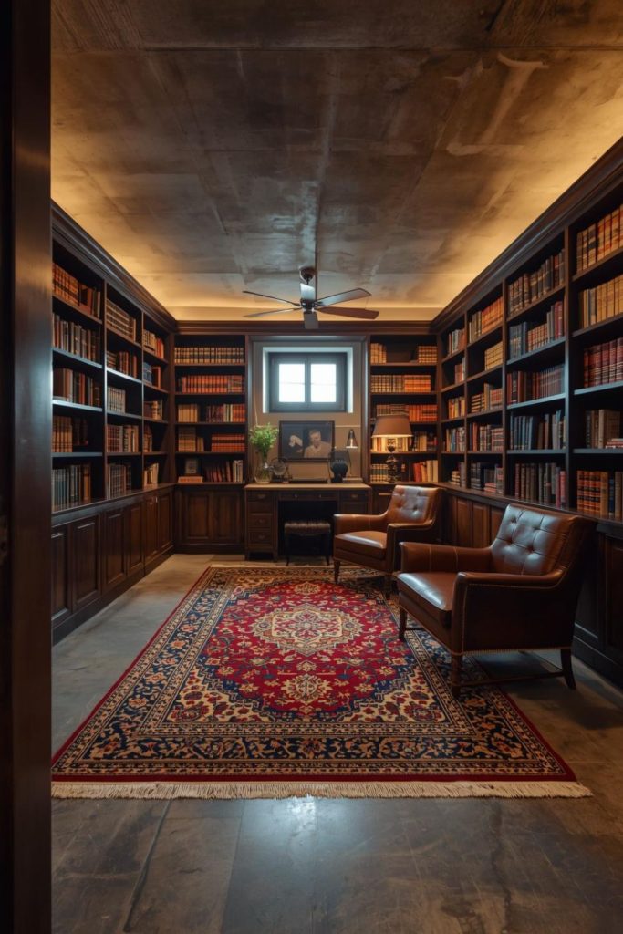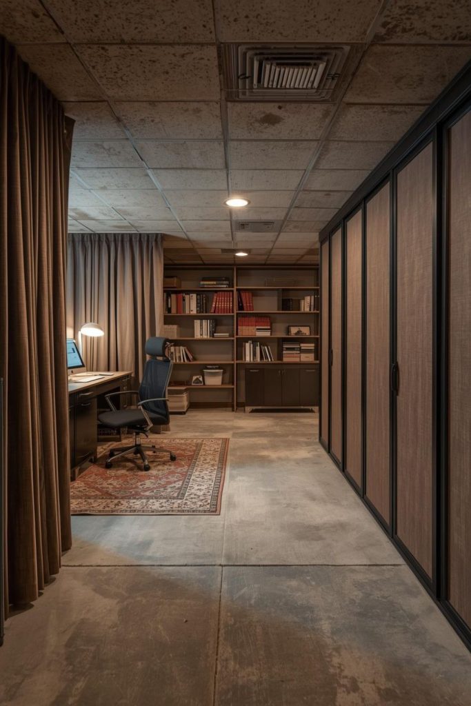 A vintage library theme gives your unfinished basement office an intellectual and cozy feel. Tall bookshelves line the walls, filled with books, notebooks, or decorative items. Leather armchairs and wooden desks add warmth and sophistication. Rugs or Persian-style carpets soften concrete floors, while soft lighting creates a relaxed atmosphere. This style works well for writers, consultants, or anyone who wants a refined, calm work environment that doubles as a reading or thinking space.