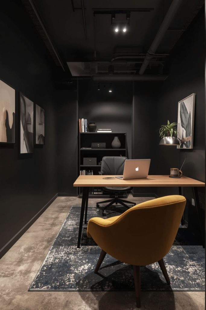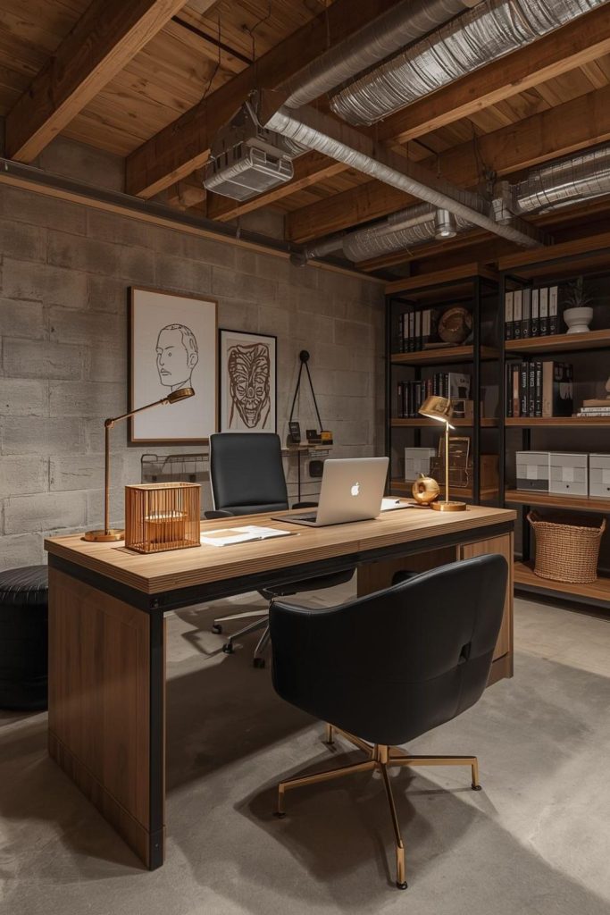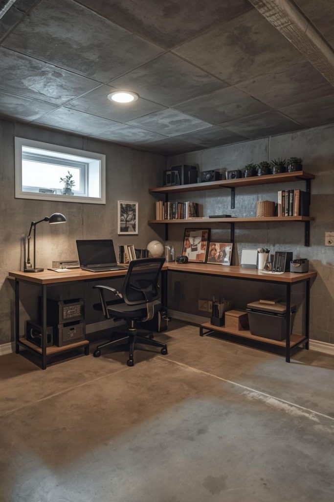A moody modern approach turns an unfinished basement office into a bold, stylish workspace. Dark walls create a cocoon-like environment that reduces visual distractions. Pairing the walls with black desks and chairs adds consistency, while accent lighting highlights specific areas—like your desk, shelving, or artwork. Metallic or glossy surfaces can reflect light subtly, preventing the basement from feeling too dark. Accessories, like statement lamps or geometric wall pieces, give the space character. This style is perfect for creative freelancers or tech professionals who prefer a modern, stylish atmosphere that’s also practical and organized.