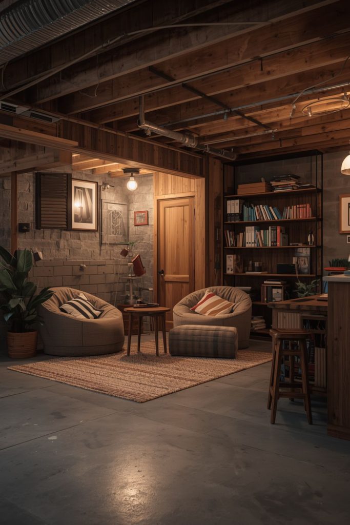For a different approach, a hygge-inspired unfinished basement office emphasizes coziness and comfort. Soft rugs help cover cold concrete floors, layered blankets and throws make seating areas inviting, and warm lamps create a gentle, relaxing glow. The key is to add textures—wool, cotton, and faux fur—so the space feels alive and comforting rather than cold or stark. Furniture doesn’t need to be fancy; plush chairs, low tables, and simple desks can all fit the theme. Small touches, like bookshelves with favorite reads or a coffee station, enhance the hygge vibe and keep you motivated during work hours. Even with unfinished walls or ceilings, adding cozy textiles and warm accents transforms the basement office into a space where you want to spend time working, focusing, or brainstorming.