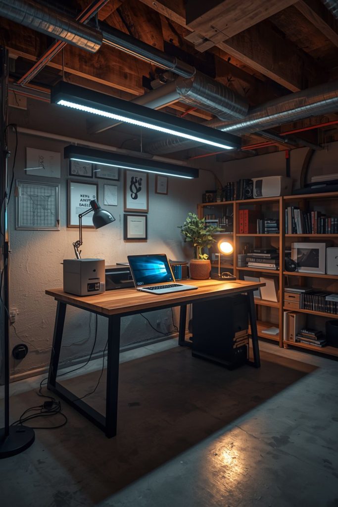 Lighting is often overlooked in basements, but it’s essential for productivity. Combine ceiling lights, task lamps, and floor lamps to avoid shadows and dark corners that strain your eyes.