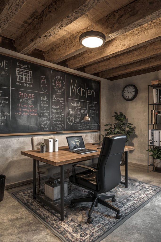 A wall painted with chalkboard paint or covered with a whiteboard allows quick notes, reminders, or sketches. It’s a functional addition for planning projects, jotting ideas, or collaborating with others, keeping the workspace dynamic and interactive.