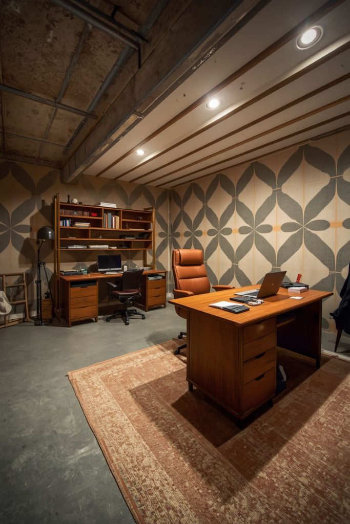 Art deco-inspired unfinished basement office with geometric patterns and retro furniture