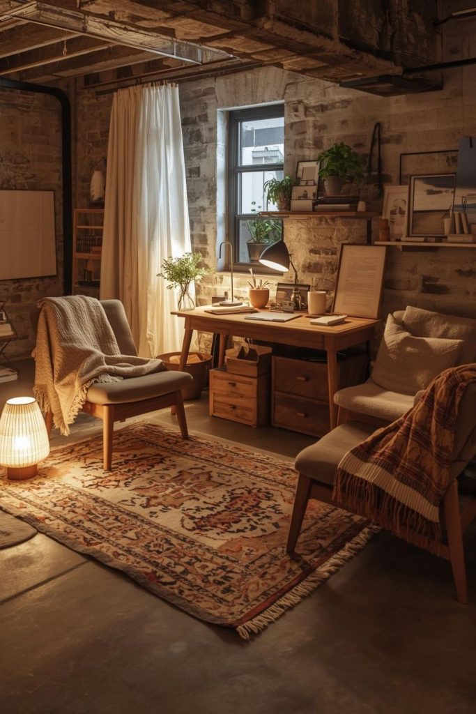 Cozy hygge-inspired unfinished basement office with warm lighting, soft rugs, and layered blankets