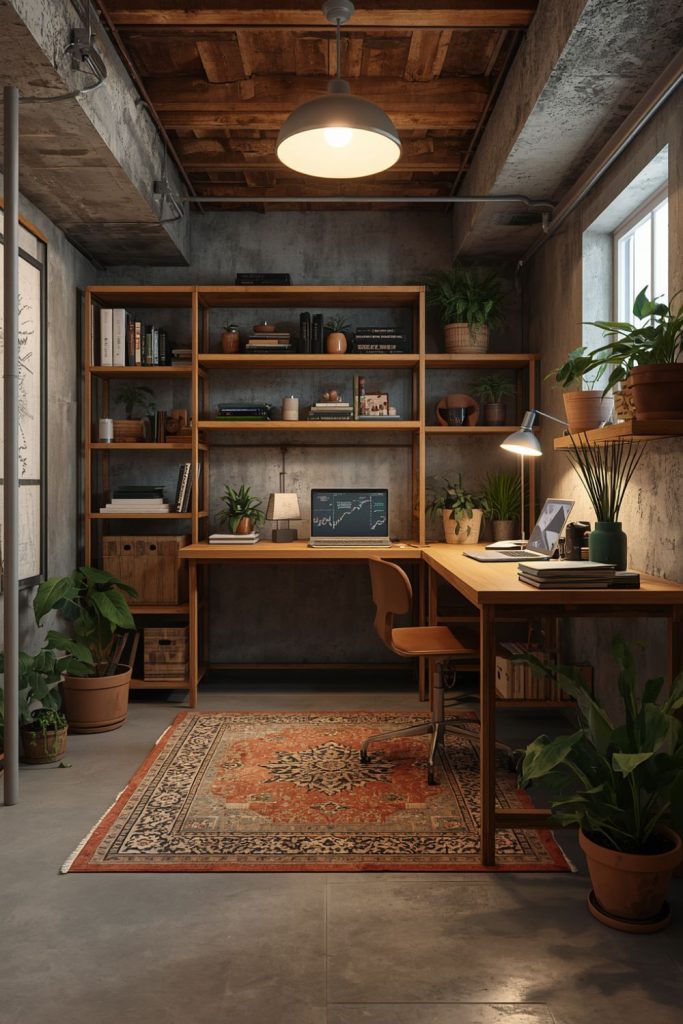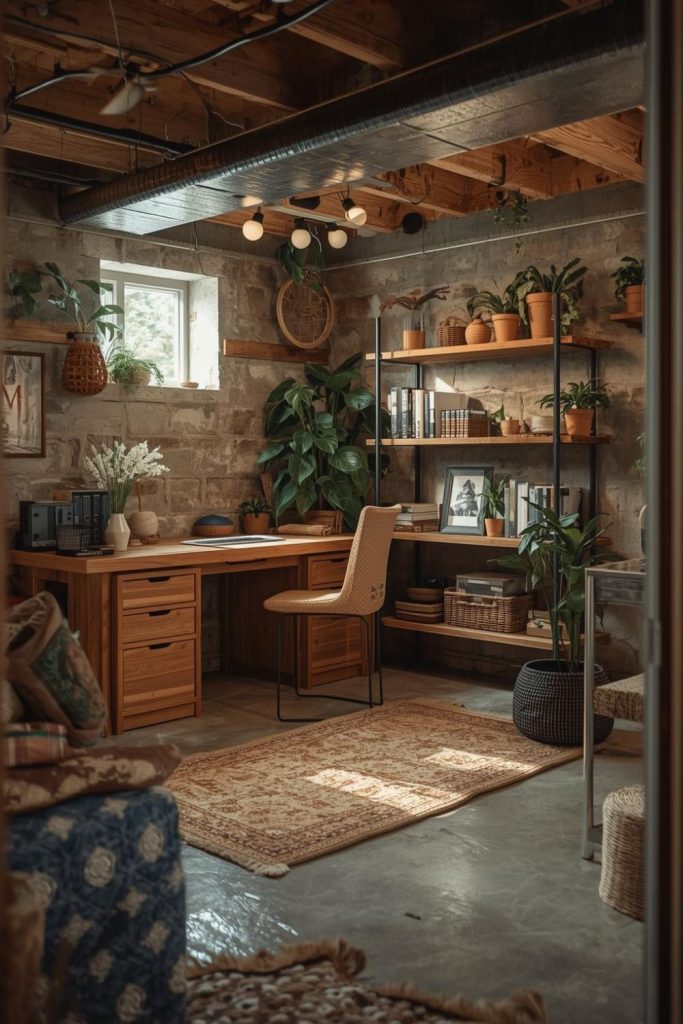 Nature-infused unfinished basement office with indoor plants, wooden textures, and natural stone accents