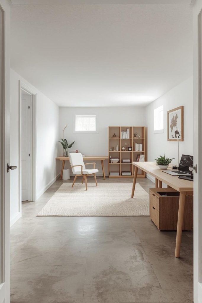 Minimalist Scandinavian unfinished basement office with light wood furniture and clean lines