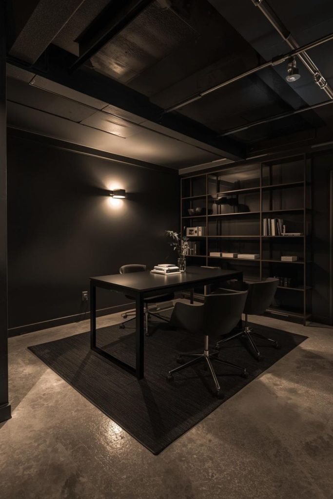 Moody modern unfinished basement office with dark walls, sleek black furniture, and accent lighting