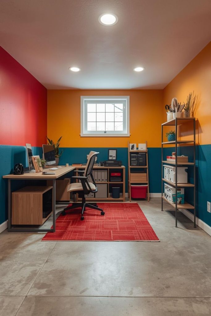 Painting one or more walls in bold, contrasting colors can instantly energize an unfinished basement office. Color blocking also visually separates zones—like work, storage, and lounge areas—without building walls. For instance, a bright blue behind the desk encourages focus, while a soft yellow in a reading corner boosts creativity. It’s an inexpensive way to make the space feel intentional, organized, and stimulating, especially when paired with neutral furniture and simple decor.