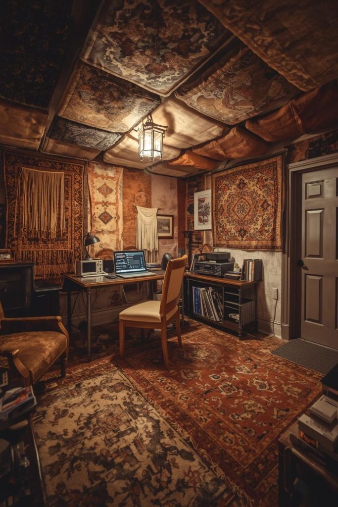 Multi-textured unfinished basement office with rugs, wall hangings, and ceiling fabrics for depth